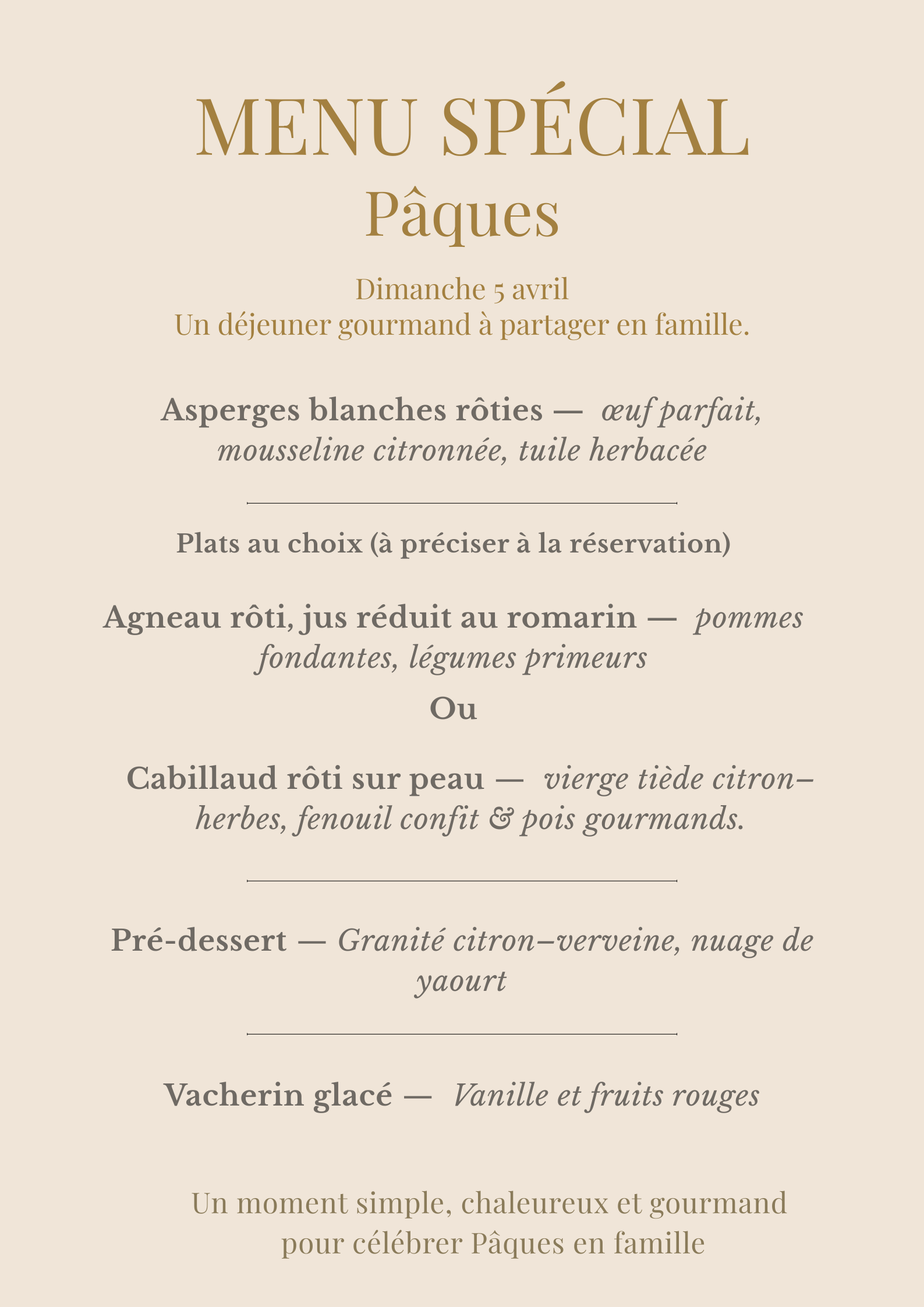Menu spécial Pâques — Dimanche 5 avril