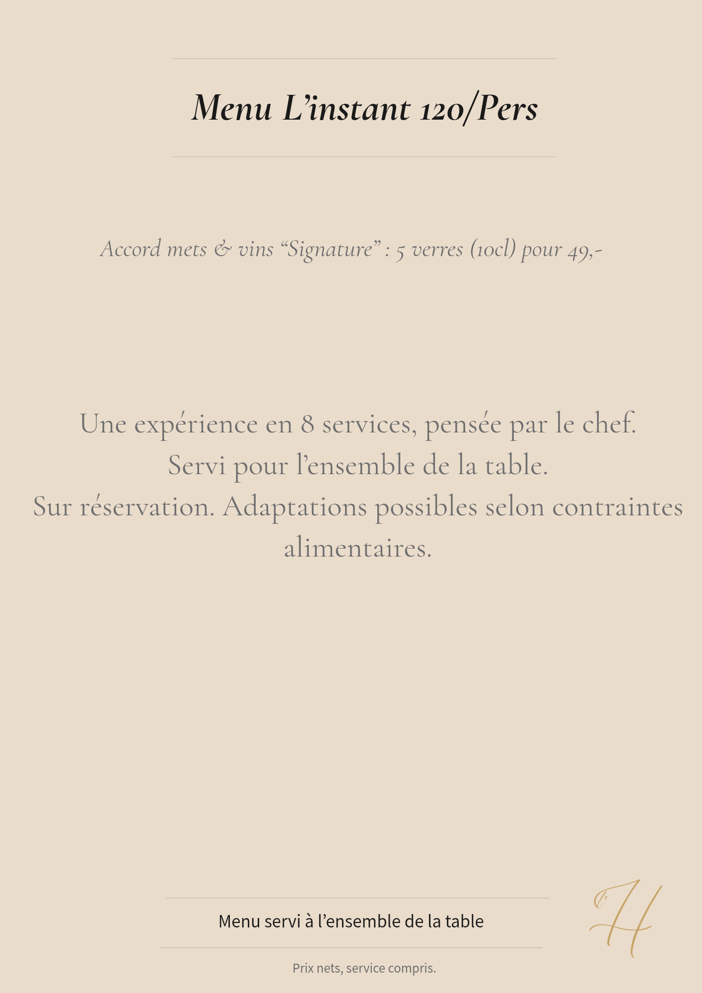 Vivez l’expérience ultime avec L’Instant, notre menu en huit services imaginé par le chef. Conçu comme une parenthèse hors du temps, ce parcours gastronomique révèle toute la créativité et la sensibilité de la cuisine, au fil de compositions inspirées par le moment, le produit et la saison. Chaque assiette est une surprise, une émotion, une exploration des goûts et des textures. Plus qu’un repas, L’Instant est une immersion totale dans l’univers du chef, où précision, audace et équilibre se rencontrent pour offrir une expérience unique et inoubliable. Pensé pour être partagé par l’ensemble de la table, ce menu est proposé uniquement sur réservation et s’adapte avec soin aux éventuelles contraintes alimentaires, afin que chacun puisse vivre pleinement cette expérience d’exception. Pour sublimer ce voyage, un accord mets & vins “Signature” accompagne chaque étape avec justesse et élégance.