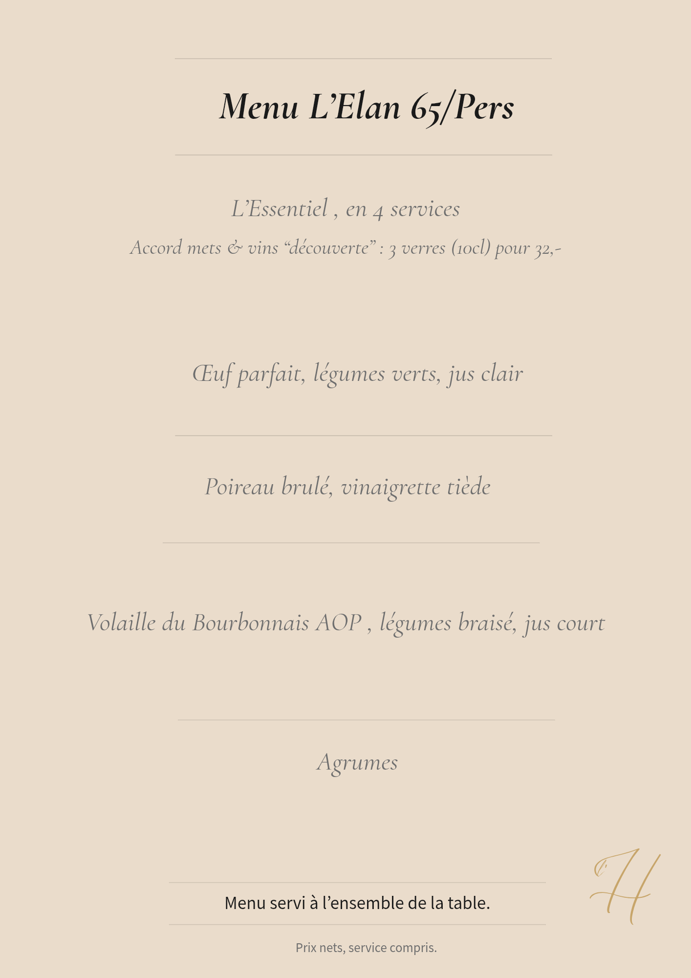 Elenco degli allergeniOffrez à vos convives une expérience gastronomique aussi élégante que mémorable avec le Menu L’Élan. Pensé comme un véritable voyage en quatre temps, ce menu met en scène des produits soigneusement sélectionnés et sublimés par des cuissons précises et des associations délicates. Chaque plat révèle une harmonie de textures et de saveurs, entre finesse végétale, intensité des jus et authenticité du terroir. De la délicatesse d’un œuf parfait aux notes subtilement grillées du poireau, jusqu’à la générosité d’une volaille du Bourbonnais AOP, chaque étape est une invitation à redécouvrir l’essentiel avec modernité. L’expérience se conclut sur une touche de fraîcheur autour des agrumes, pour une finale légère et équilibrée. À partager par l’ensemble de la table, le Menu L’Élan s’accompagne idéalement d’un accord mets & vins “découverte”, pour une immersion complète dans l’univers du chef.