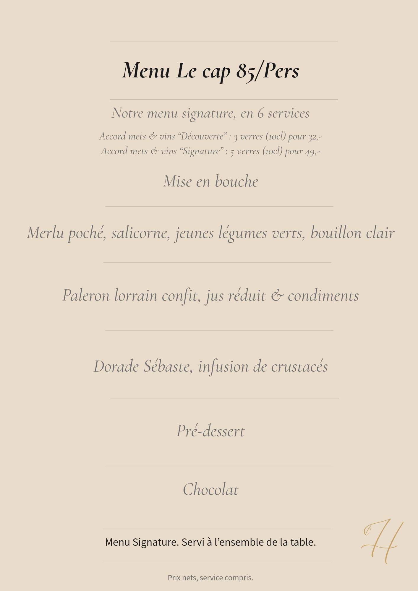 Plongez au cœur de l’expérience gastronomique avec Le Cap, notre menu signature en six services. Pensé comme une véritable traversée culinaire, ce menu d’exception met en lumière le savoir-faire du chef à travers des créations précises, audacieuses et profondément ancrées dans le produit. Chaque assiette raconte une histoire, entre fraîcheur marine, richesse des terroirs et maîtrise des jus. De la délicatesse d’un merlu poché aux notes iodées, à la puissance maîtrisée d’un paleron confit aux jus réduits, jusqu’à l’élégance d’une dorade sublimée par une infusion de crustacés, chaque étape révèle une intensité croissante et parfaitement équilibrée. Rythmée par une mise en bouche et un pré-dessert tout en finesse, l’expérience se conclut sur une création autour du chocolat, à la fois gourmande et raffinée. Proposé pour l’ensemble de la table, Le Cap s’accorde idéalement avec nos sélections de vins “Découverte” ou “Signature”, pour une immersion complète et inoubliable dans l’univers du chef.